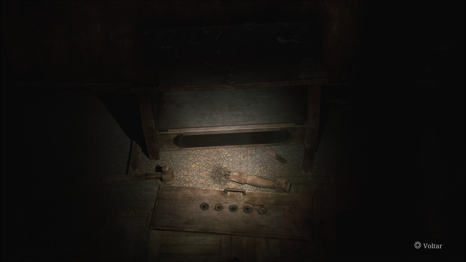 Vá até a cozinha, abra a gaveta e pegue Balas de Pistola. Arrebente a parede frágil ao lado para sair no corredor, e volte até o Apartamento 210 para resolver o quebra-cabeça da Gangorra. Comece colocando a Estatueta de Cisne e a Estatueta de Pombo na gangorra. Como você pode perceber, elas não têm o mesmo peso, então a gangorra fica desigual. O nosso objetivo é posicioná-las de modo que a gangorra fique equilibrada. Deixe a Estatueta de Pombo na ponta a esquerda e a Estatueta de Cisne na segunda posição da esquerda para direita. Feito isso, a gangorra quebrará com o peso das estatuetas, revelando a Chave Alada. Use essa chave para destrancar a porta à esquerda da televisão, aqui do lado. Entre, e verá um enorme buraco. Não temos escolha a não ser saltar neste buraco para chegar ao primeiro andar.