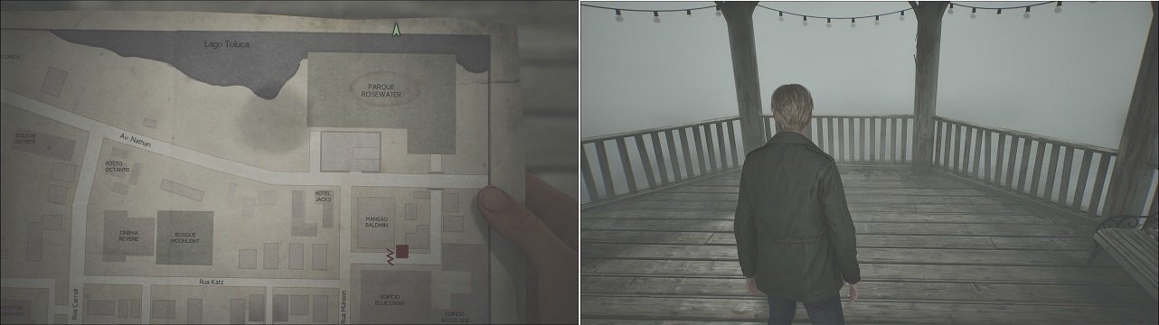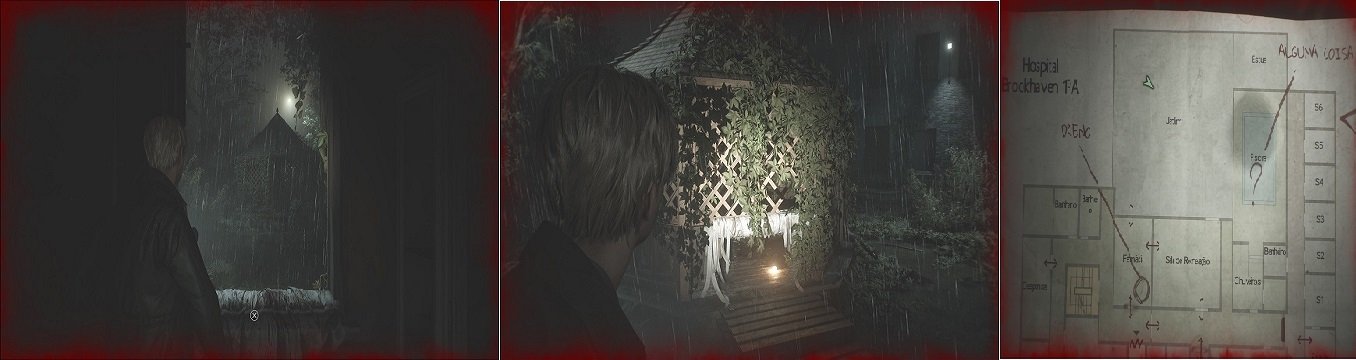 Durante a exploração no Hospital Brookheaven, deveremos sair para o Jardim em direção a Piscina. Nesse Jardim, após eliminar todos os inimigos, verifique o Gazebo central. Dentro do Gazebo, encontramos um inimigo e alguns itens, dentre eles o Baú Pequeno, combine ele com a Chave Enferrujada para conseguir o Cláudia Branca. Esse item deve ser usado no Quarto 312 quando estiver no Hotel Lakeview. (Item necessário para o Final Renascimento).