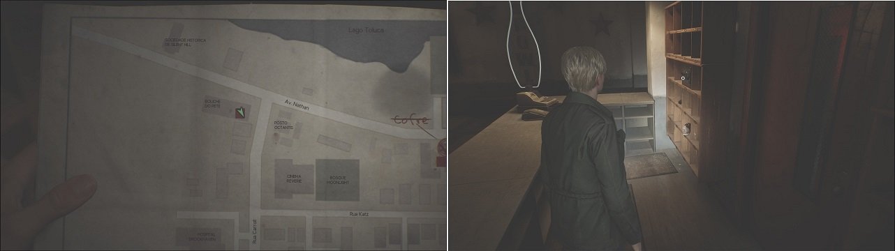 Nosso próximo item está no Boliche do Pete na Rua Carrol, assim que entrar, siga para o lado oposto do balcão e note o cofre ao lado da porta. A senha para abrir esse cofre é 1887, conseguiremos a Chave Enferrujada (1/4) (Item necessário para o final Renascimento). Dentro desse cofre também encontramos o último memorando do jogo, chamado de Carta Enigmática. Esse item não é necessário para o troféu Arquivista, desde que você tenha coletado todos os memorandos na primeira campanha.