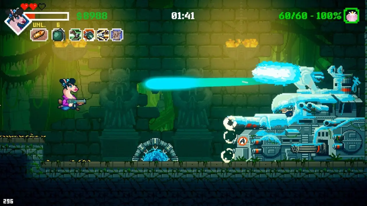 A primeira vista, nosso protagonista é o mais improvável dos animais, já que pouco de nós já se imaginou jogando com uma lhama bestialmente armada e cheia de pressa. Não bastando isso, os desenvolvedores da Chaosmonger Studio deixaram nosso protagonista com uma pegada ainda mais radical e estilosa, como podemos notar nos primeiros minutos do jogo.