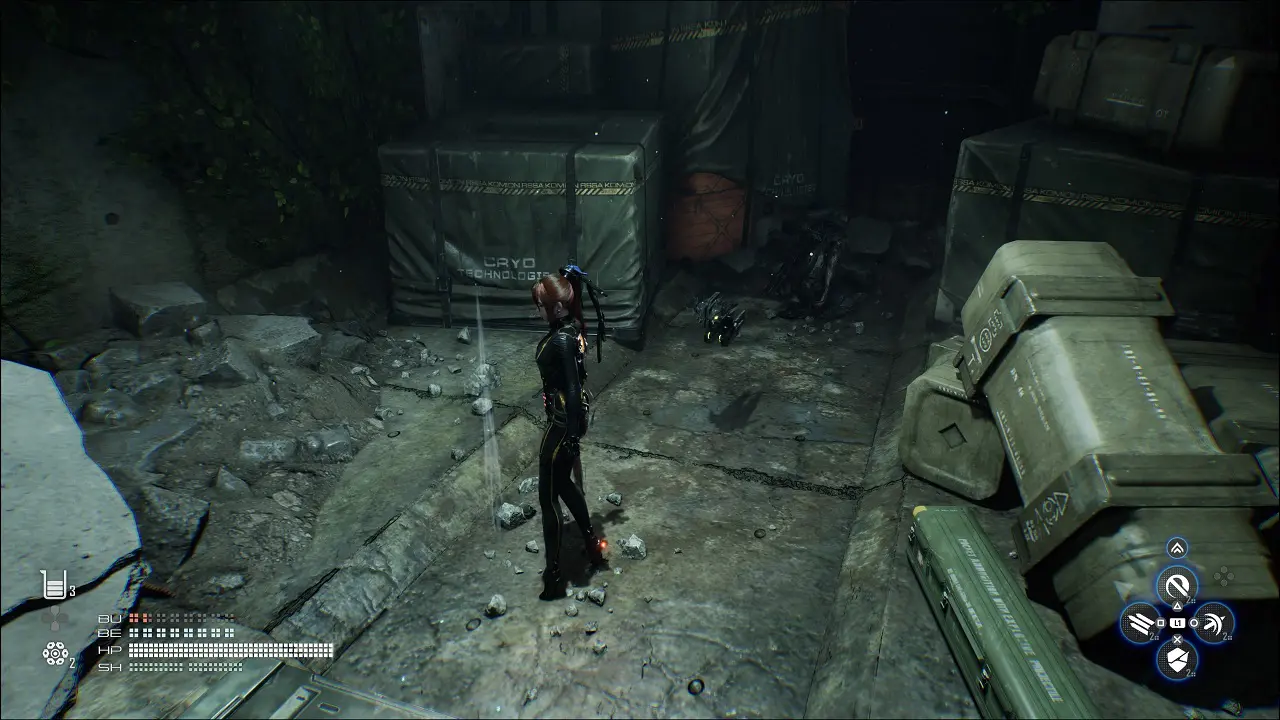 Use o elevador e assim que estiver na parte mais alta, corra e mate os inimigos antes que eles possuam os corpos. Estaremos em um entroncamento com quatro caminhos diferentes. Primeiramente, siga para o caminho a sua frente em direção à comporta, encontraremos um corpo com o Cartão de Memória: Conselho de Norman. Estando de costas para a sala principal, siga o caminho a direita, eliminando furtivamente o inimigo, entre na sala e elimine mais um inimigo antes que ele reviva o cadáver. Quebre aos objetos aqui para encontrar algum item e abra a caixa para encontrar a Exoespinha Tipo Transe Explosivo.