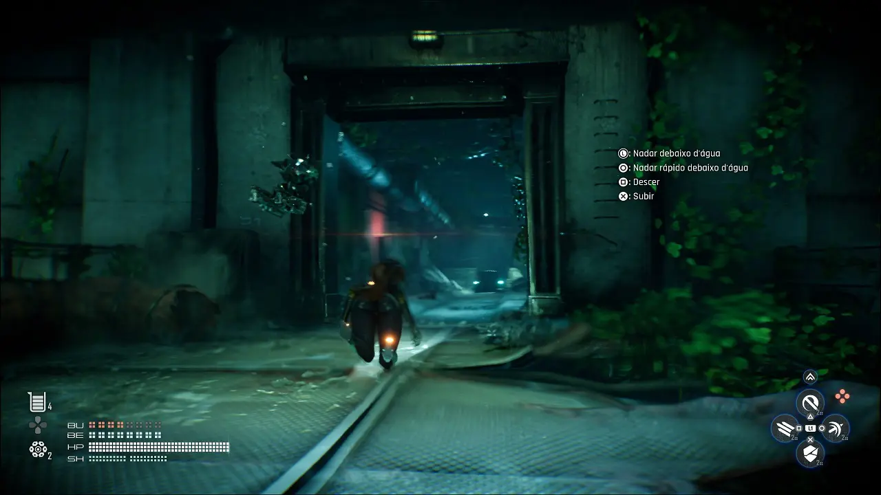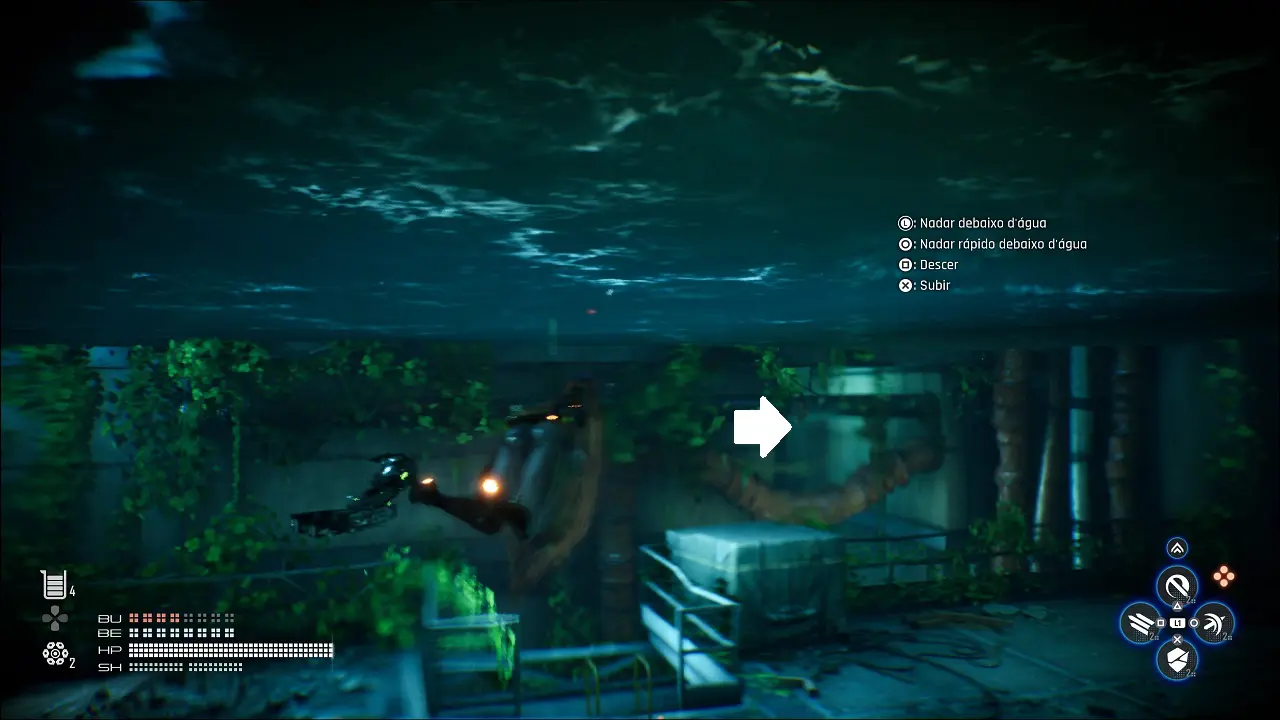 Volte até a sala principal, a mesma que usamos o elevador para subir. Ela estará totalmente alagada. Pule na água e antes de seguir para o objetivo principal, vamos atrás de alguns itens importantes. Estando na água, mergulhe e siga para o túnel onde recolhemos a Célula de Fusão que usamos para acionar o levador, perto do fim da sala, suba para encontrar um novo corredor com uma Caixa de Suprimentos, digitalize o código corretamente para acionar a caixa.