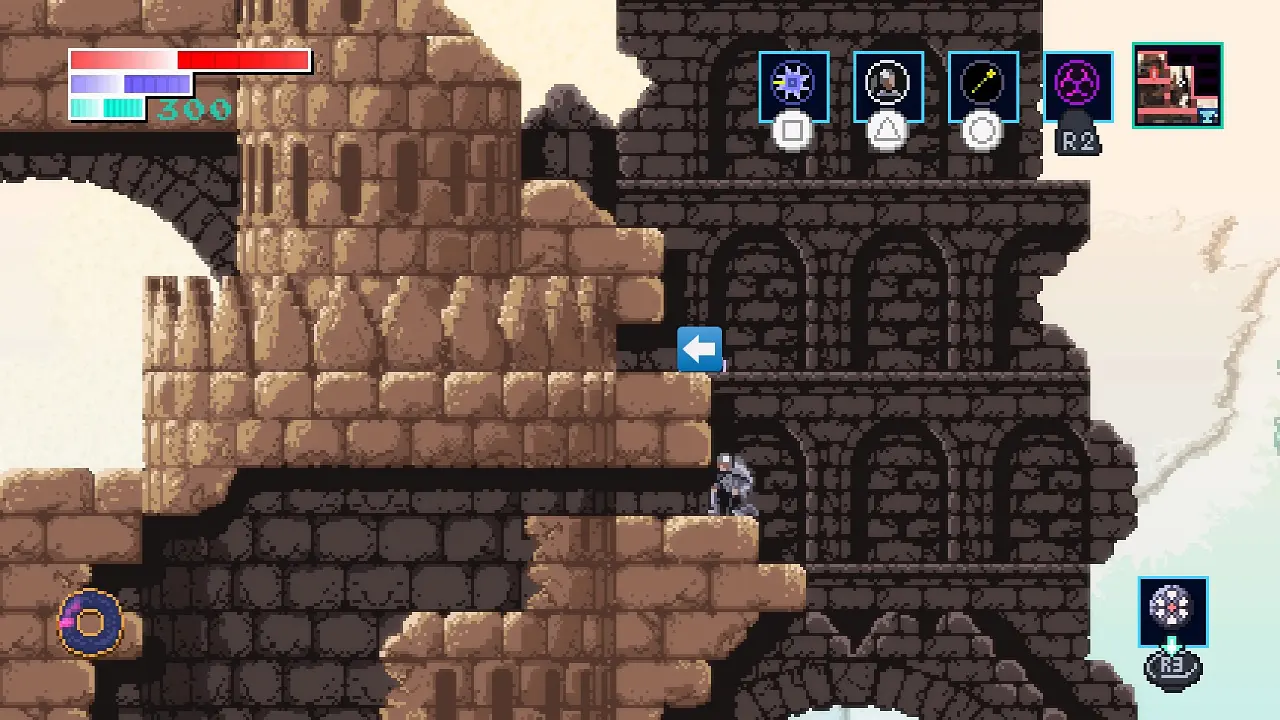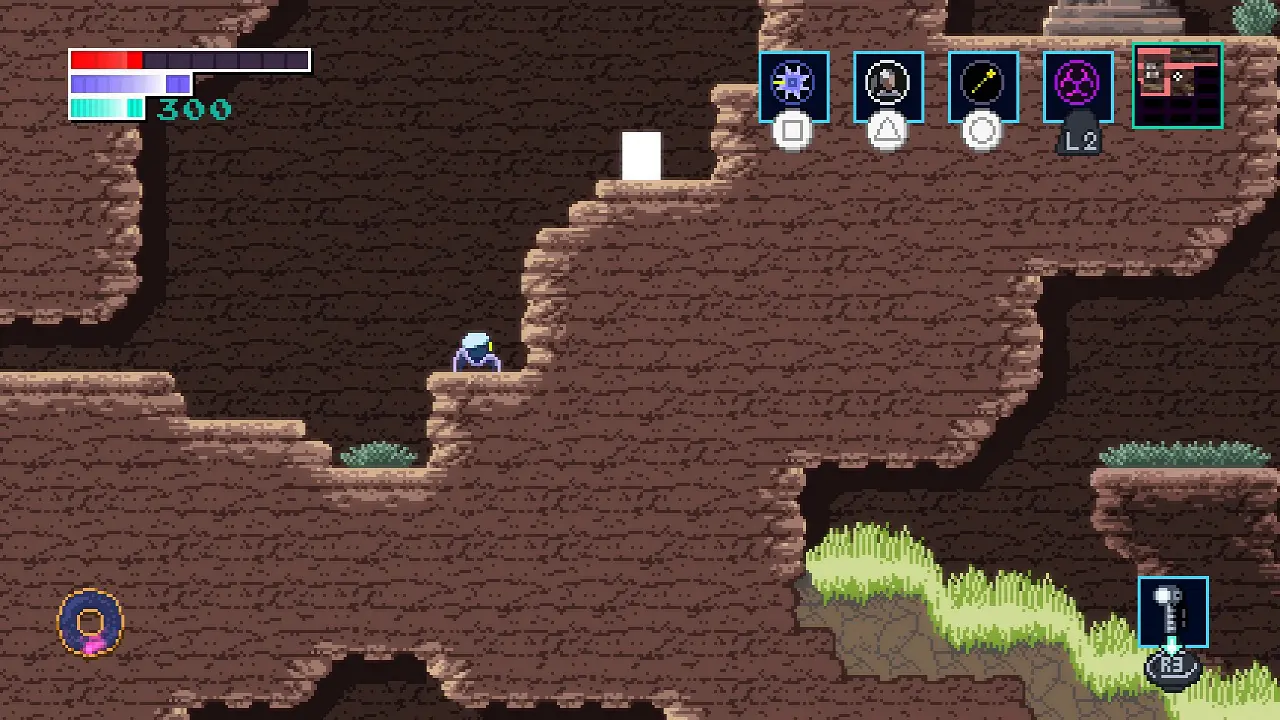 Use o Save Point, abra a porta e retornaremos ao nosso corpo. Mas não acabou, lance o Drone novamente e com a nossa nova habilidade subiremos pela passagem estreita a direita, logo acima do portal e conseguiremos um FRASCO DO APOCALIPSE P. Você nem havia reparado nessa passagem né?