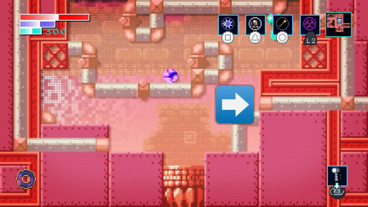Siga para a direita descendo, você vai chegar ao Save Point, salve seu progresso e com a nova habilidade, escale a parede e passe sobre a porta laser, chegando ao mecanismo que desativa a porta. Nossa recompensa é um atalho de volta para a área anterior, mas ao sul nesta sala você também pode ver um estranho portal na terra. Vá para a esquerda para encontrar um FRASCO DO APOCALIPSE P
