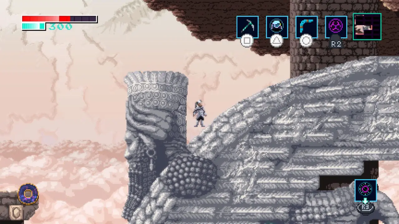 Voltando ao nosso corpo, recomendo que volte ao Save Point para guardar seu progresso, pois enfrentaremos um inimigo poderoso em breve. Feito isso, volte ao ponto em que estávamos, use seu Drone para subir na parede novamente, avance e na próxima tela, elimine o inimigo e suba na plataforma logo ácina. Siga pela esquerda e abra aporta com seu Hack. Siga e na próxima área, suba e logo a sua direita estará um arquivo: REGISTRO DO DIÁRIO – IDÉIAS PERIGOSAS. Agora vamos para a esquerda agora e… Hora de enfrentar um Boss.
