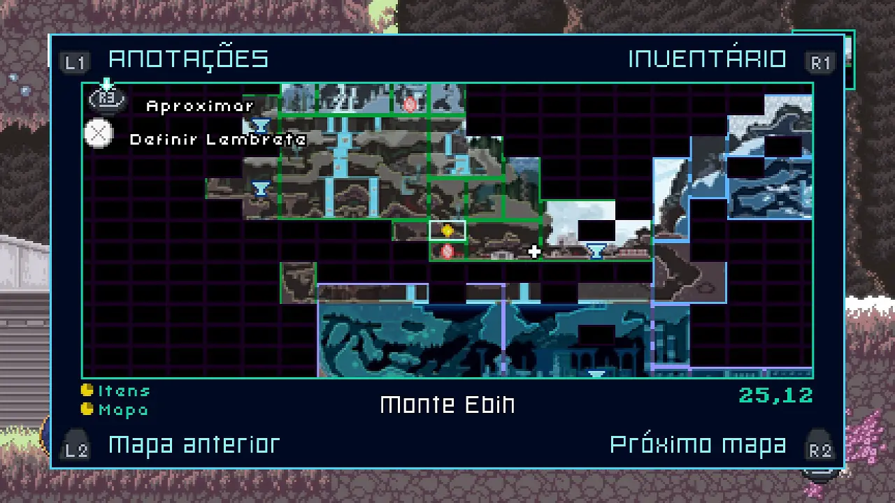 Agora, nossa próxima exploração será ao sul. Por enquanto, volte para Cliffside a base desta área. Fica a sudoeste nas coordenadas 13,16. A partir daqui, temos mais algumas explorações para fazer. Iremos para o sudeste (para baixo e para a direita). Siga pela direita até chegar em um ponto que, anteriormente, não podíamos acessar devido à altura, agora com nosso drone podemos fazer isso.
