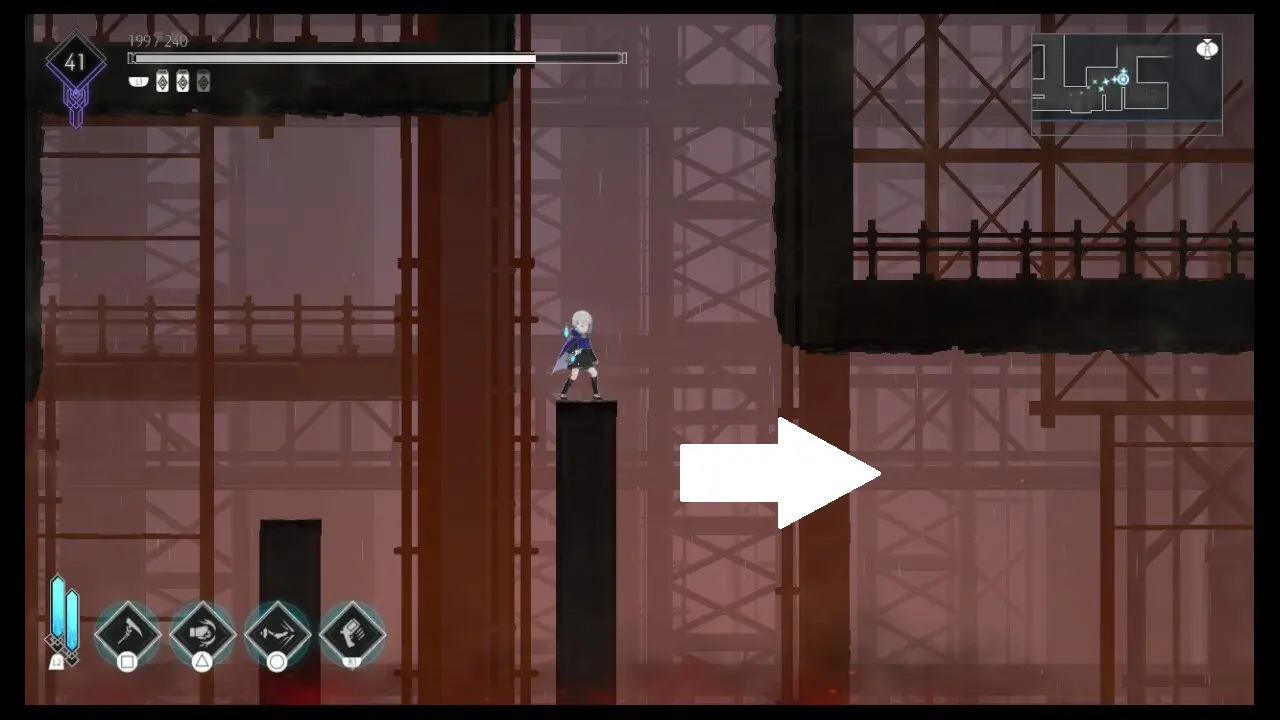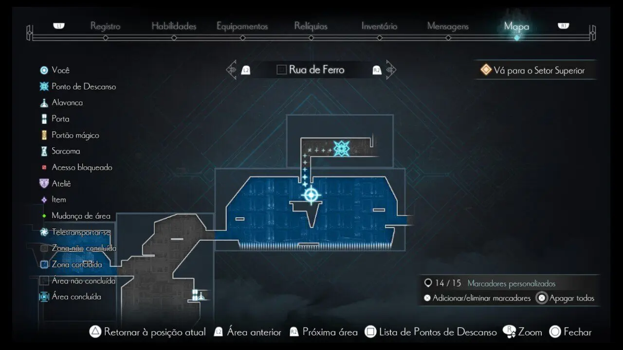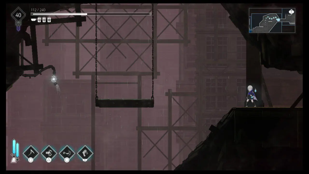 Se o capítulo anterior foi bem curtinho, esse não será, e nos levará as alturas, usaremos nosso gancho como nunca! Vamos em frente, converse com os NPCs e na próxima área, cuidado com o buraco e o inimigo preso na parede. Escale e siga por baixo, entre na próxima passagem para encontrar o Ponto de Descanso: Banco da Rua de Ferro. Continue à direita e saia pela próxima área.