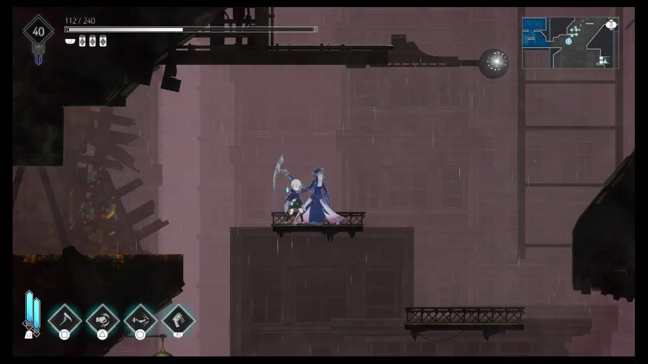 Quando estiver no controle novamente, escale o prédio à direita, e continue escalando, preso a parede, salte, corra e salte novamnte em direção a borda, escale até o topo para encontrar um Fragmento de Amuleto. Desça tudo e siga á direita para encontrar o Ponto de Descanso: Torre de Combate. Esse Ponto de Descanso antecede uma batalha contra o chefe de fase, mas antes disso, lidaremos com dois Mini-Chefes em sequência, para piorar, se morrer em qualquer um dos três inimigos, voltaremos ao Ponto de Descanso. Recomendo que você tenha a Spica equipada para recuperar todo seu PH após as lutas, isso pode ajudar muito, mas a escolha é sua.