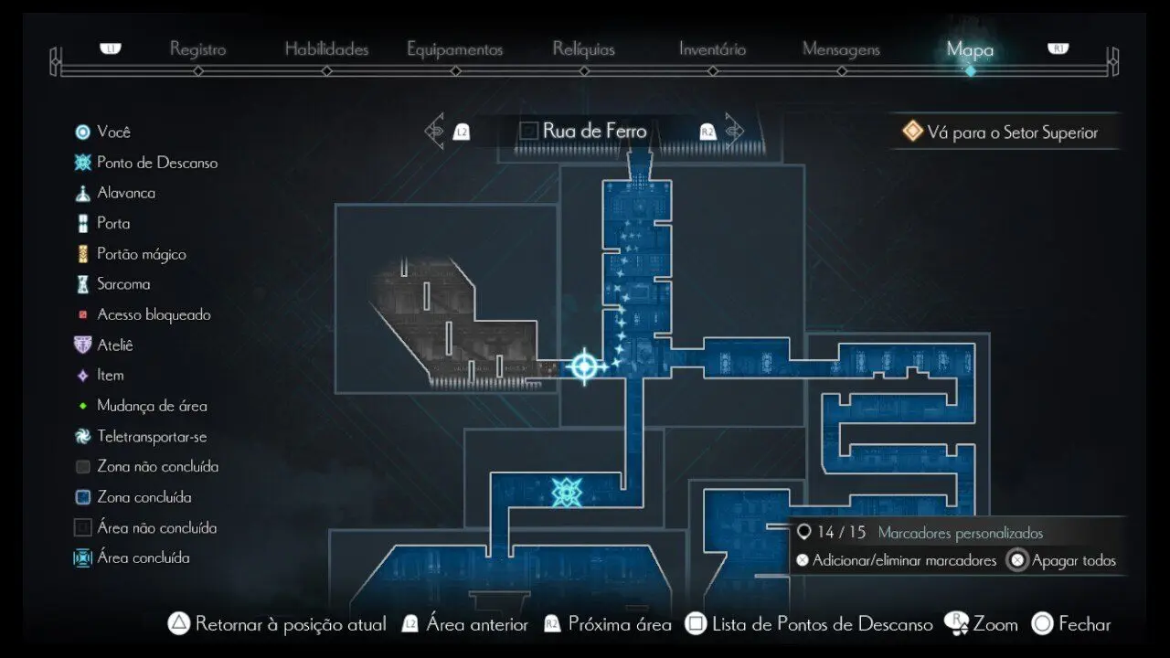 Após a batalha, assista as cenas e a conversa, sintonizaremos o Homúnculo Nº7, ele nos fornece um ataque muito bom, se projetando enquanto protege Lilac, infelizmente ele tem um tempo de recarga. Enfim, saia pelo telhado pela passagem à direita, acione a alavanca para abrir a porta que leva ao Ponto de Descanso, mas antes de sair, pegue o Grampo de Hermetita mais à direita. No Ponto de Descanso, converse com os lutadores que derrotamos, faça uma Viagem Rápida para o Distrito Central, no Ponto de Descanso: Banco do Distrito Central.