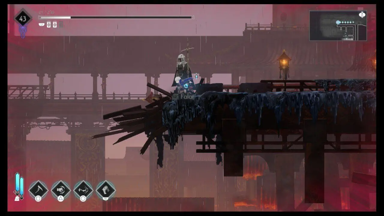 Essa é uma sala na forma de corredor, com plataformas em chamas e diversos samurais, siga com cuidado, eliminando todos e desviando das paredes e plataformas e chamas. A próxima sala terá várias pilastras e duas saídas, uma na parte central no teto e outra no canto inferior direito, vamos sair pelo teto primeiro, um elevador. Conforme você sobe, note o item à esquerda, pegaremos ele em breve. No topo, converse com o NPC do lado esquerdo na beira do penhasco. Teremos de descer e imediatamente, saltar e correr para se agarrar na pilastra inferior menor, descer novamente, saltar e se agarrar na maior, e saltar para a plataforma com o item para conseguir o Fragmento de Amuleto. Para voltar, use a mesma estratégia ou somente deixe-se cair, leva um pouco de PV, nesse caso.