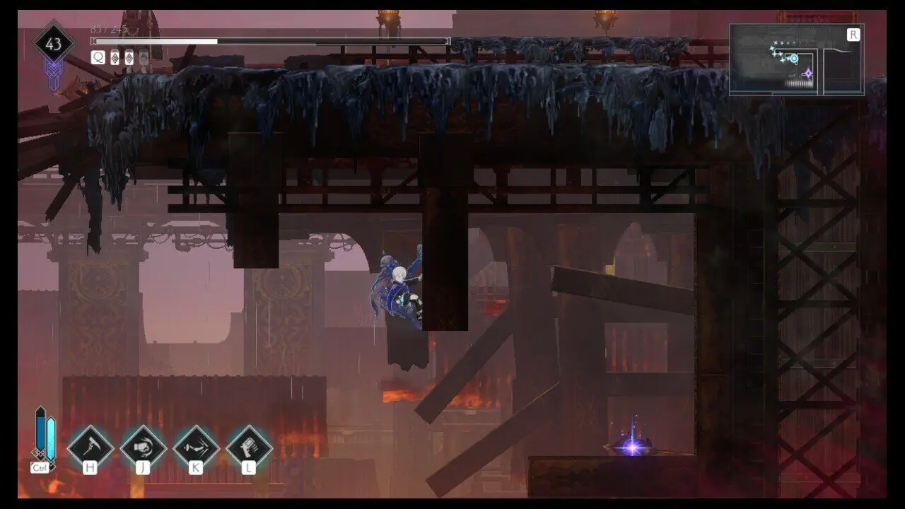 Siga à direita entrando na sala quando parar, lide com os inimigos, quebre as caixas e colete os Destroços x250. Volte a sala anterior e escasale a parede, use agarra para ir para o lado esquerdo da sala, escale novamente, entrando na sala acima. Entre, elimine os inimigos e abra o baú para encontrar um Grimório. Volte a sala principal, use o ponto acima de você e quando descer no ado extremo direito, escale a parede, entrando na sala logo acima, pegue o Aviso da torre de Combate. Volte e desça até o ponto de saída dessa sala, desça para a sala imediatamente acima do Ponto de Descanso, note a passagem à esquerda que ainda não exploramos. Estamos em mais uma longa sala vertical, então vamos subir, entrando na primeira passagem a esquerda.