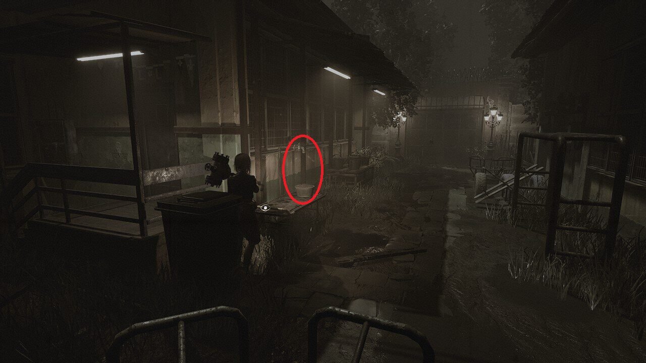 Colete o Diário do zelador Jacob, zelador da escola 2 (46/64) na pia dos fundos, entre na parte adjacente para chamar a atenção de um caranguejo, derrote a criatura e verifique o objeto para ter uma referência de um certo filme de terror. Verifique o último vaso para encontrar gasolina, saia.