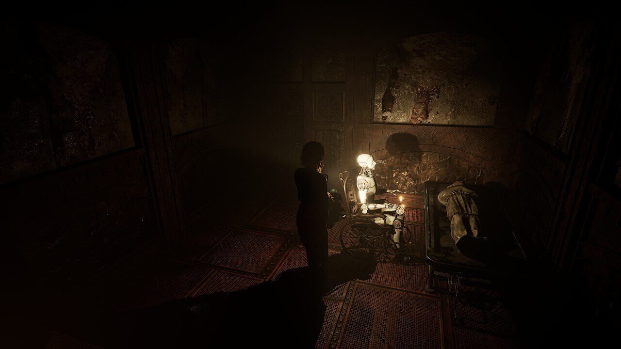 Cuidado com os três inimigos caranguejos pularão dos banheiros aqui. Depois que eles estiverem mortos, pegue o Povidone do banco e interaja com o espelho. Você precisará usar seu isqueiro para acender as velas corretas.