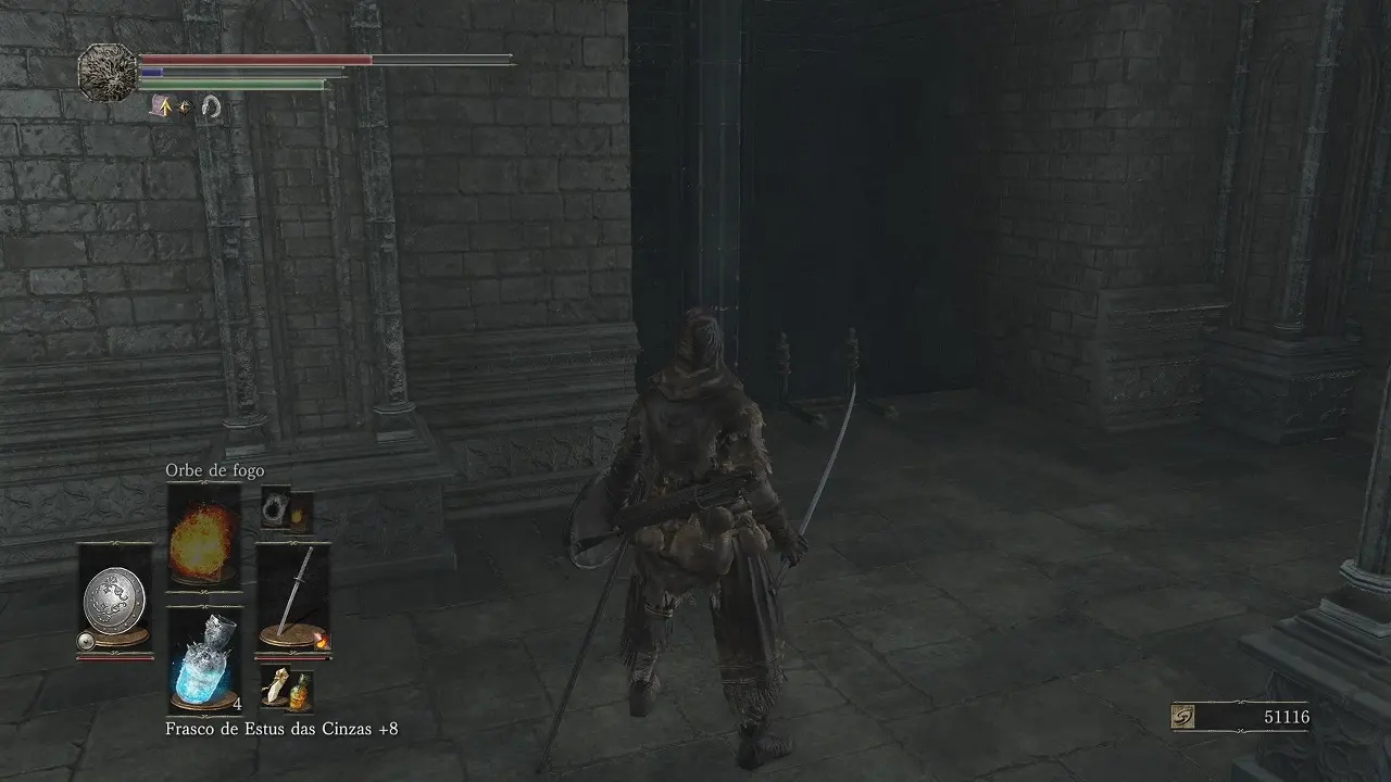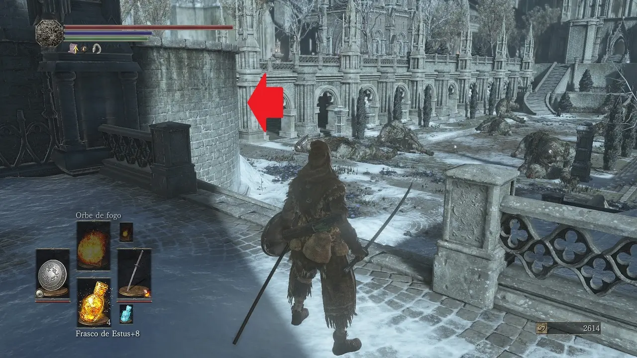 Avistando o pátio, note os arcos à esquerda, corra até la e dentro, note as Sombras à direita nos fundos, elimine todas e colete o Anel de quartzo de escuridão. Volte e saia pelo arco oposto de onde veio (caiu) e suba a escada, note que na parte elevada, atrás da escada que acabou de subir, corra até a porta, mas não entre imediatamente. Siga pela varanda à esquerda da porta, tomando cuidado com os ataques inimigos, no final dessa varanda, saqueie o corpo para conseguir uma Placa de titanita. Volte e passe pela porta.