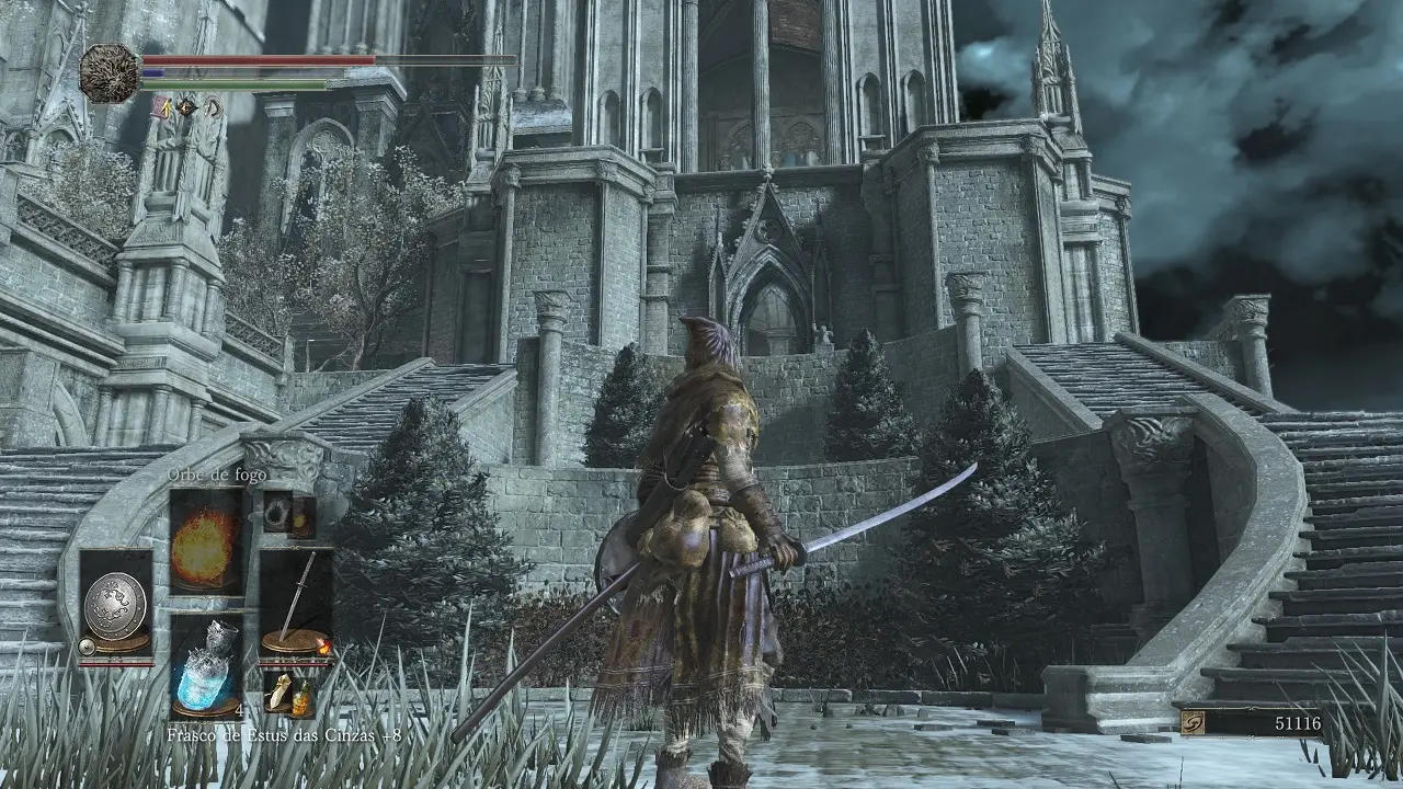 Partindo da fogueira, suba a escada em direção a catedral devagar, pois você enfrentará um Lanceiro e um Cavaleiro, ambos muito poderosos. Como elesestão descendo a escada, você terá uma boa janela de ataque e pode enfrentar um por vez sem maiores problemas. Ambos deixaram cair um Fragmento de titanita, continue subindo. No topo, repare no mirante à esquerda para encntrar um corpo com a Grande Alma de Cavaleiro Fatigado. Olhando para a porta da catedral, siga para a passagem do lado direito, cuidado com o Cavaleiro Negro patrulhando a área, ele também deixará um Fragmento de titanita e na varanda escada abaixo, colete a Alma de Cavaleiro Abatido. Volte para a porta de entrada principal no topo da escada para a fogueira e desta vez prossiga para a esquerda. Passe pela porta aberta aqui para encontrar um gigante morto, ao lado do corpo, colete a Hulha de gigante. Suba as escadas ao lado do Gigante até chegar ao edifício principal da catedral.