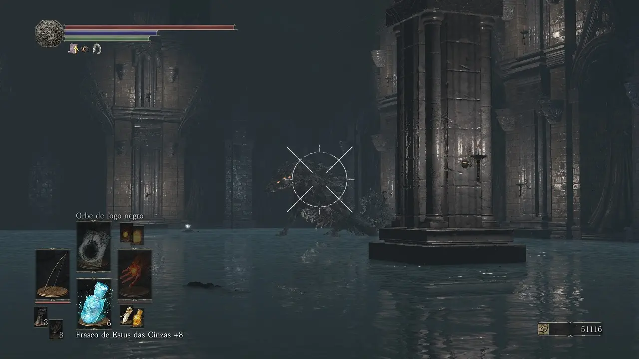 Inicialmente, você encontrará algumas Lesmas presas no teto e outros Diáconos espalhados pela área, todos bem posiconados, use as colunas para se proteger e role para se aproximar e atacar. Quando vencer todos, ignore a passagem acinzentada que leva ao chefe da área e siga em direção a porta oposta, prepare-se para um combate contra uma Aranha amaldiçoada. Como você já sabe, o monstro é agressivo, mas você terá toda a extensão do local para enfrentá-la. Vencendo a Aranha, você recebe a Joia de Aldritch, ela não aparecerá novamente. Aqui você também encontrará um baú com um Fragmento de Estus (8/11), não deixe de coletar isso. Ainda dentro da área, suba a escada oposta a que descemos e colete as Flechas do amanhecer no corpo. Acione a alavanca à esquerda da porta para abri-la, e criar o atalho para a fogueira Anor Londo, e consequentemente, para o chefe da área. Descanse na fogueira e viaje para o Santuário do Elo de Fogo.