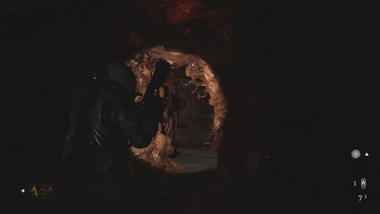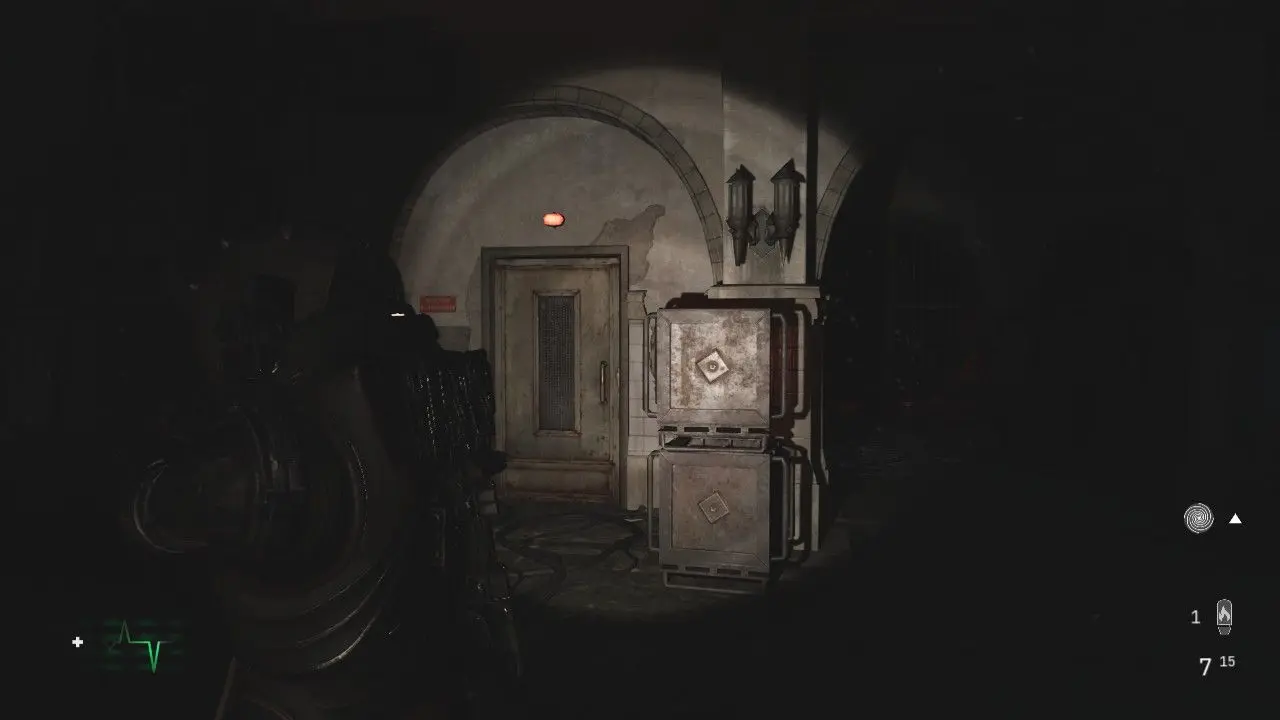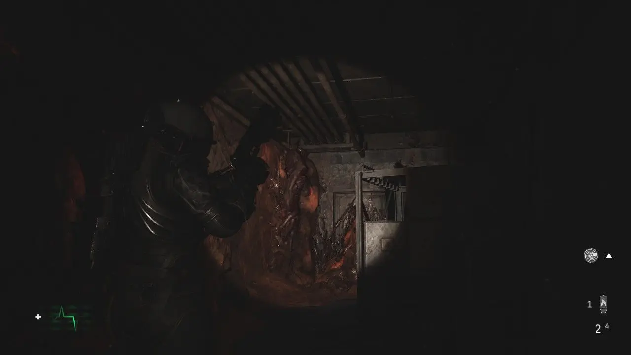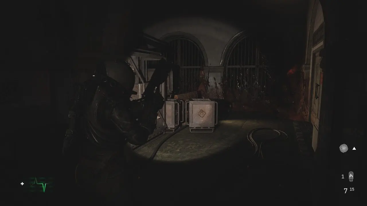 Entrando, você será agarrado por um novo tipo de inimigo, um Wallcorpse. Essas criaturas estão fundidas às paredes e irão agarrá-lo com tentáculos enquanto você passa para sufocá-lo, lembrando muito uma criatura encontrada em Dead Space. Nessa área, encontraremos diversas dessas criaturas, algumas, bem escondidas. Pressione o botão na tela para se libertar, não deixe de coletar o item na prateleira ao lado da entrada.