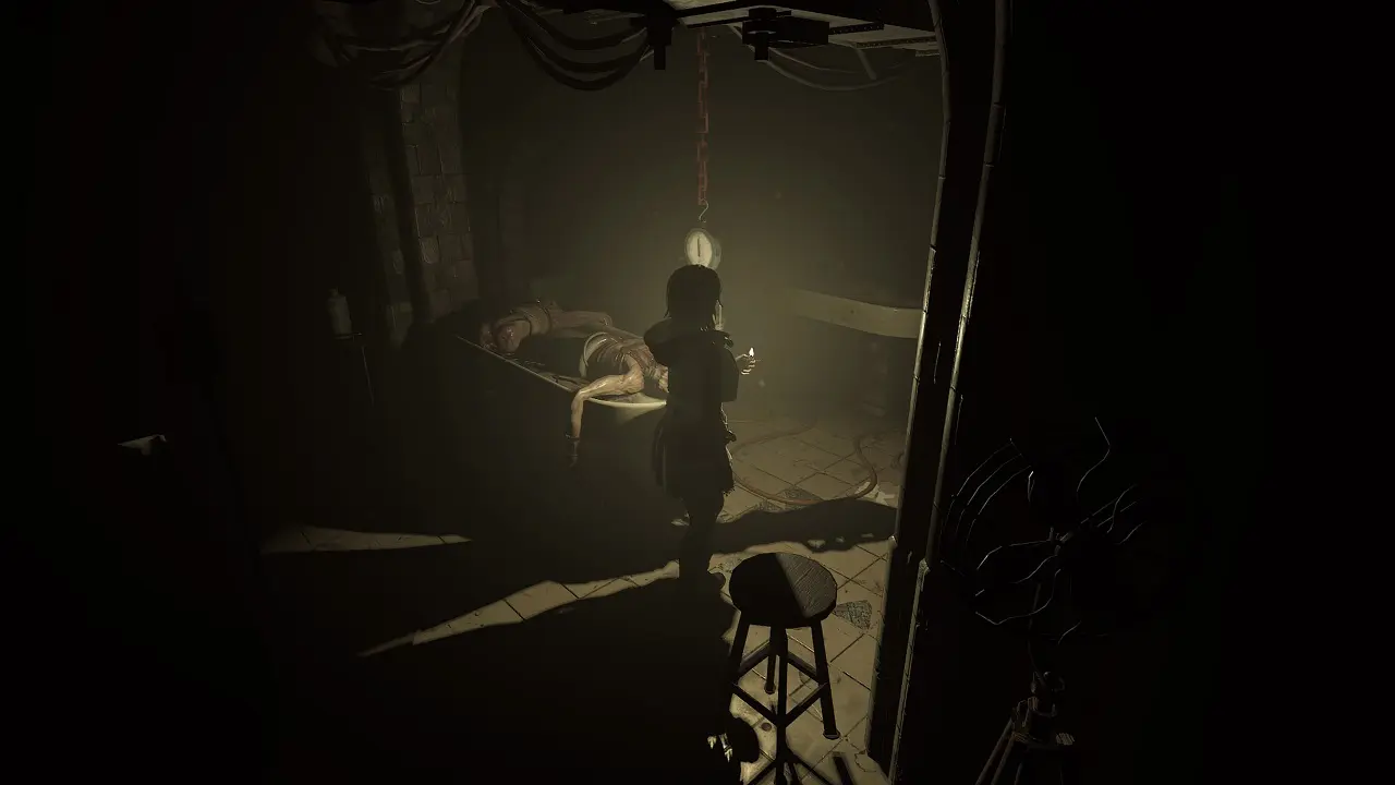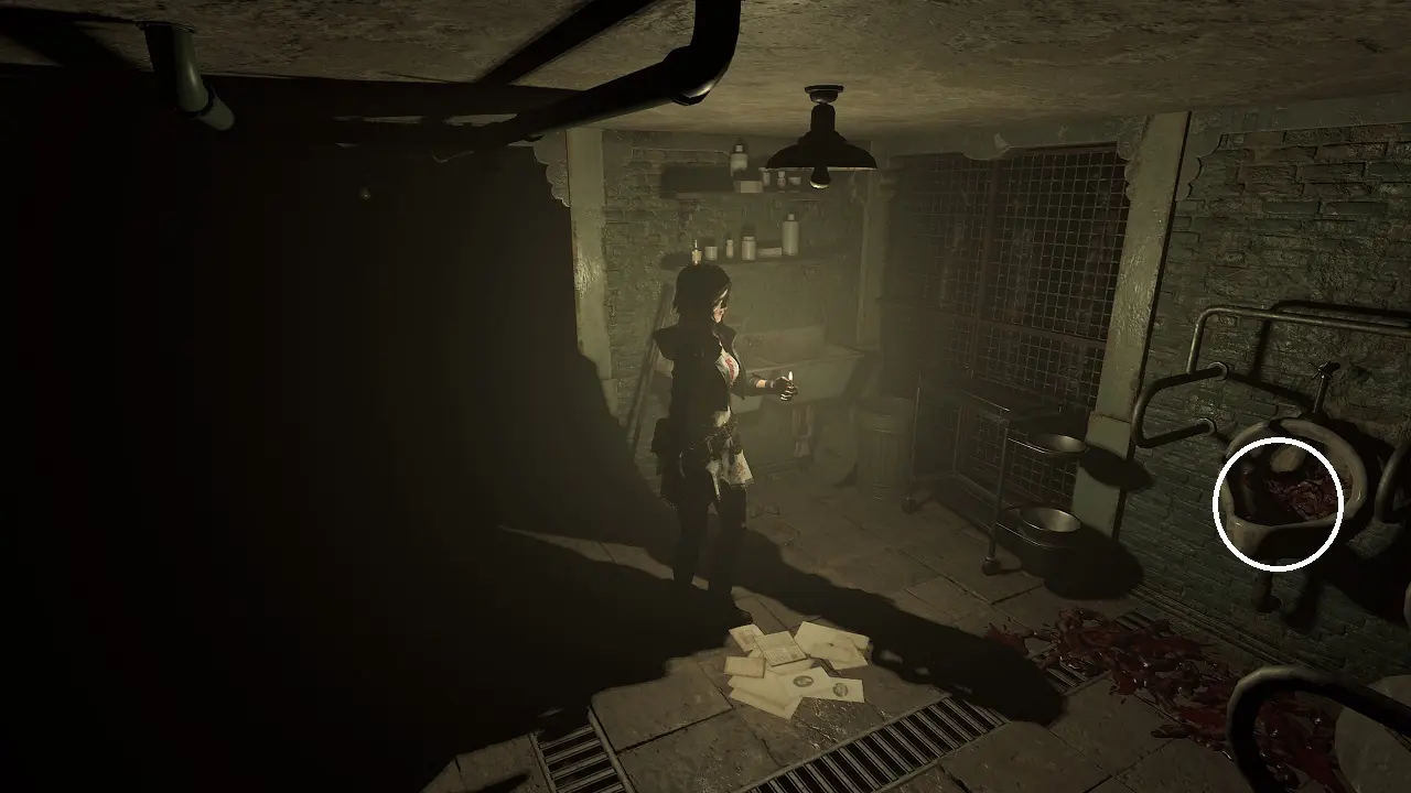 Siga até o final do corredor e vire a direita para encontrar o alçapão que verificamos anteriormente, use o bisturi que coletamos anteriormente para cortar as cordas, desça pela escada e chegaremos em uma nova área.