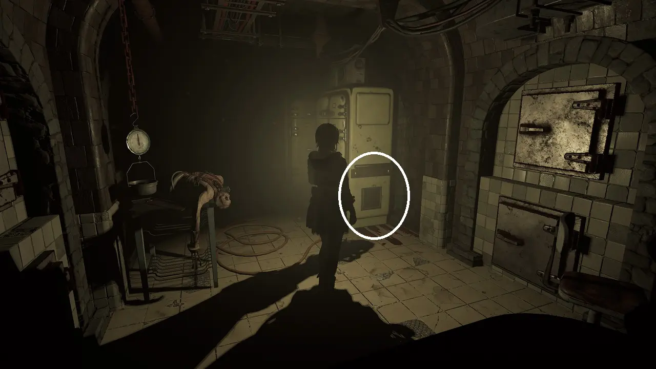 Apesar da música, não há inimigos na sala, siga para a porta do lado oposto e destranque ela, aproveite e pegue a caixa de pregos sobre a mesa. Volte e siga pelo corredor a esquerda passando pelas macas e gavetas. Note o freezer encostado na parede com marcas de sangue no chão, puxe esse freezer para encontrar uma passagem secreta. Desça as escadas e entre em uma nova sala.