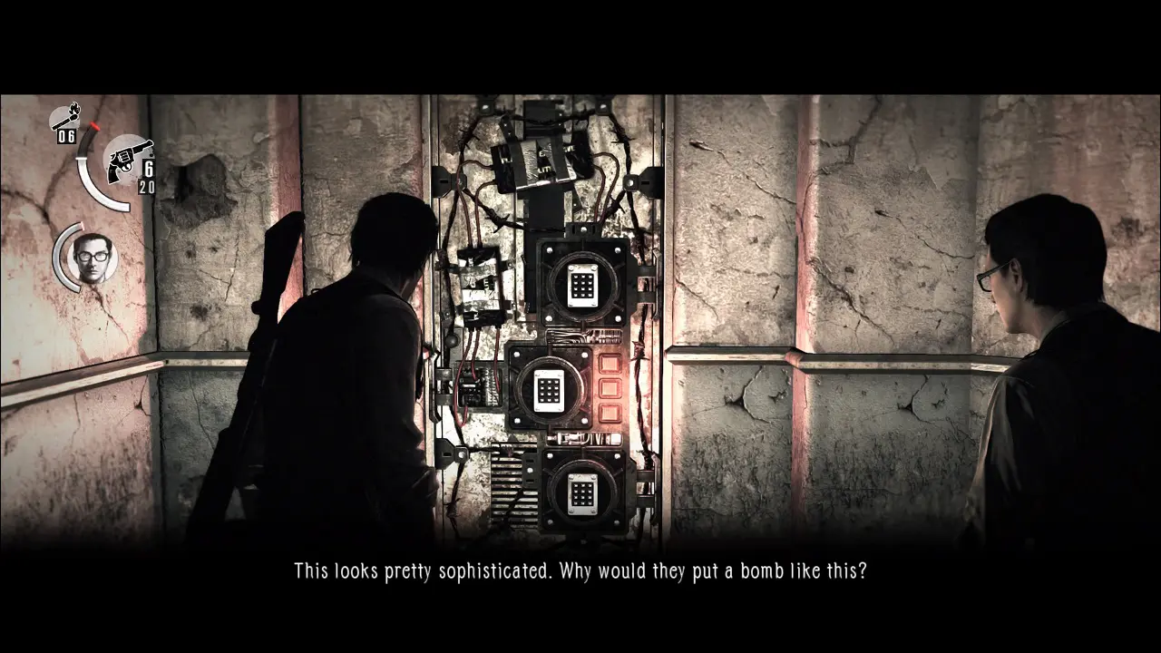 Na sala de onde os inimigos vinharem, quebre o armário no fundo, para conseguir munição. Siga em frente e repare na lata inflamável no chão, siga pela porta a esquerda e assim que entrar, queime o corpo do lado esquerdo, abra o pequeno armário e o outro maior mais ao fundo para pegar alguns itens. No fundo, encontraremos uma Syringe e Green Gel. Saia da sala, desça as escadas e peça para que Joseph desarme a armadilha, em seguida entre na sala e uma cena começará.