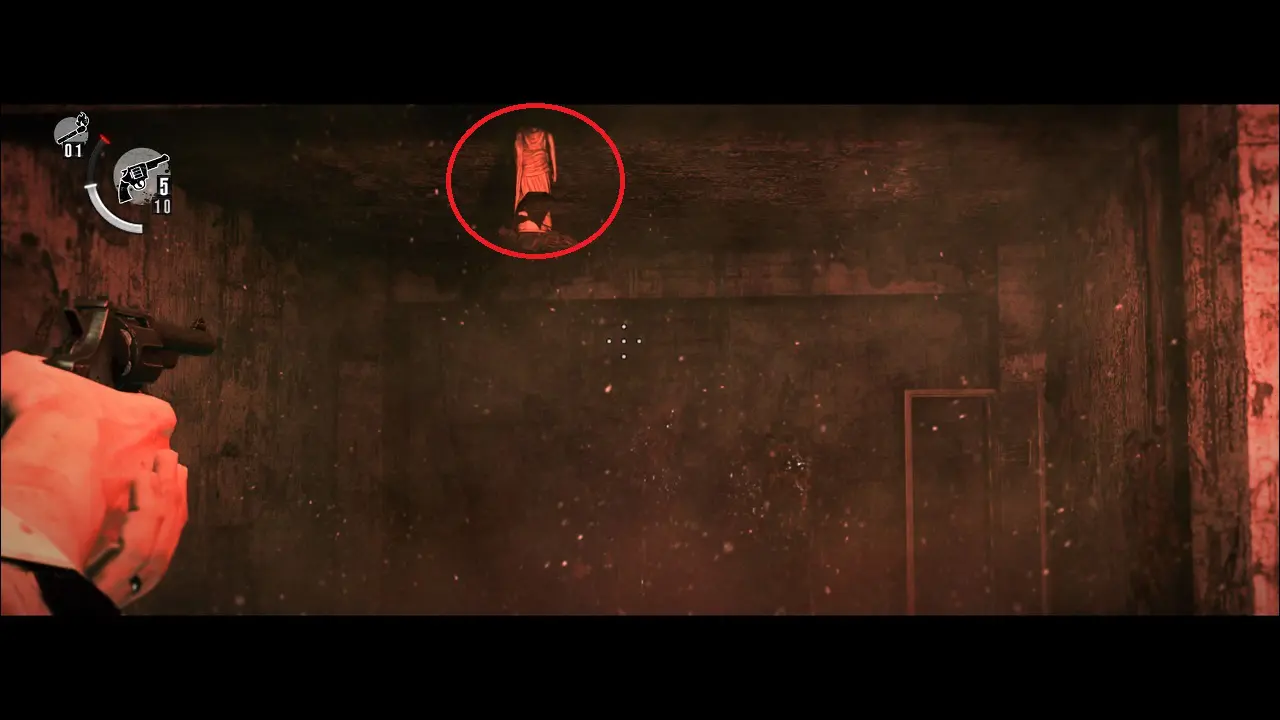 Volte para o corredor e entre na primeira sala da direita, ignore o corpo, apenas pegue a Munição no armário e saia. Siga um pouco mais a frente no corredor e entre na sala a esquerda para encontrar alguns Matches e Green Gel. Equipe sua espingarda, pois assim que sair e começar a seguir pelo corredor, um inimigo invisível aparecerá atrás de você, perceba ela avançando através da água no piso e os objetos se mexendo, acabe com ele e queime o corpo, receba 1000 Green Gel.