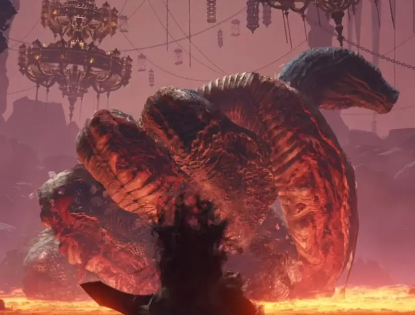 O inimigo da vez será a Serpente Devoradora de Deuses. Comece pegando a Arma: Caçador de Serpentes bem à frente. Equipe essa arma, ela não possui exigência de atributos e é uma arma razoavelmente boa, mas será imprescindível nessa luta. O chefe passa o tempo todo cercado por lava, o que torna difícil atingi-lo com golpes físicos de perto. Ele também é resistente a magia, tornando nossos feitiços pouco eficientes. Essa lança chamada Caçador de Serpentes possui um poder especial que só funciona quando estiver lutando contra serpentes gigantes: seus golpes atingem uma enorme área à frente, e ainda perseguem o alvo. Essa batalha será complicada de se lutar com outra arma. Com o Caçador de Serpentes, poderá atingi-lo com golpes físicos mesmo a média distância dele. Mire nele, fique à média distância e golpeie para que seu golpe vá até a serpente. Certifique-se de estar com escudo equipado também, ele será muito útil para aparar os golpes dele. Os golpes do chefe são fortes e atingem uma longa área, tome cuidado. Defenda-os ou esquive na hora certa. O golpe de agarrão dele precisa ser desviado. Não invoque sua cópia nessa batalha! Mantenha-se firme, causando dano de pouco em pouco, até derrotar o chefe.