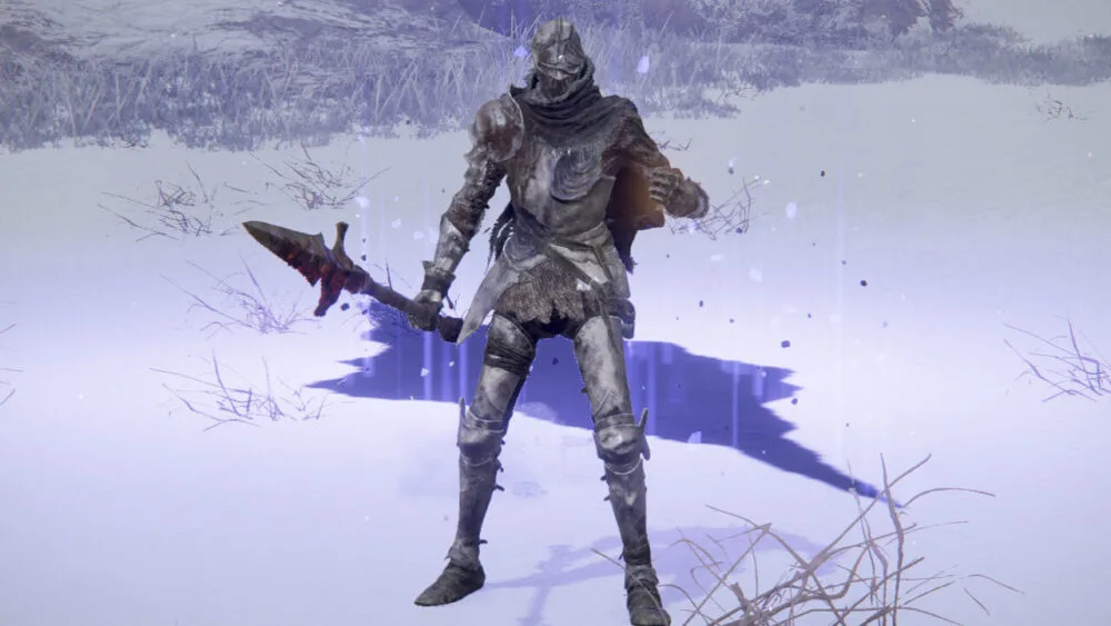 Antes de ir ao local de graça, siga para oeste para pegar 2 Sebos Inflamáveis com Cordão. Agora ative o Local de Graça: Terras Proibidas e fale com a Melina. Passe o tempo até ficar de noite. Bem, como o sinal da graça aponta para nordeste, vamos para nordeste, seguindo a estrada em meio à neve. Será atacado por diversos membros da milícia vulgar à frente. Tente pegá-los desprevenidos, eles estão em bom número e muito mais fortes do que antes. Suba o pilar caído na parte da direita para pegar uma Runa Dourada no corpo. Siga em frente, o caminho é simples e linear, não tem como se perder. Se estiver de noite, aparecerá uma Cavalaria da Noite. Já está acostumado a enfrentá-los, o problema é esse local em que estamos. É um desfiladeiro cercado por penhascos, então qualquer passo em falso e você pode acabar caindo para a morte. Lutar a cavalo aqui é uma loucura, a melhor tática aqui é lutar a pé mesmo. Use a sua Espada Grande da Lua Sombria e um escudo. A ideia é manter o escudo erguido, tomar o golpe dele no escudo e então usar a Explosão de Luar logo em seguida. A Cavalaria da Noite costuma vir, bater e se afastar, então terá tempo de sobra para banhar a espada com o poder da lua ou se curar, se for necessário. Mantenha-se do lado oposto ao braço em que ele estiver com a arma, e ele demorará mais para dar os seus golpes, mas cuidado. Olhe bem o terreno em volta para não cair. Tente ficar sempre perto dele, defendendo o ataque e então atacando, só se afaste para se curar ou para banhar a espada novamente em luar. Provavelmente o derrubará do cavalo rapidamente, e então poderá dar um golpe crítico nele no chão. No chão, ele é muito mais fraco e vulnerável, mas ele costuma invocar outro cavalo rapidamente. Ao derrotá-lo, conseguirá a Cinza da Guerra: Corte Fantasma.