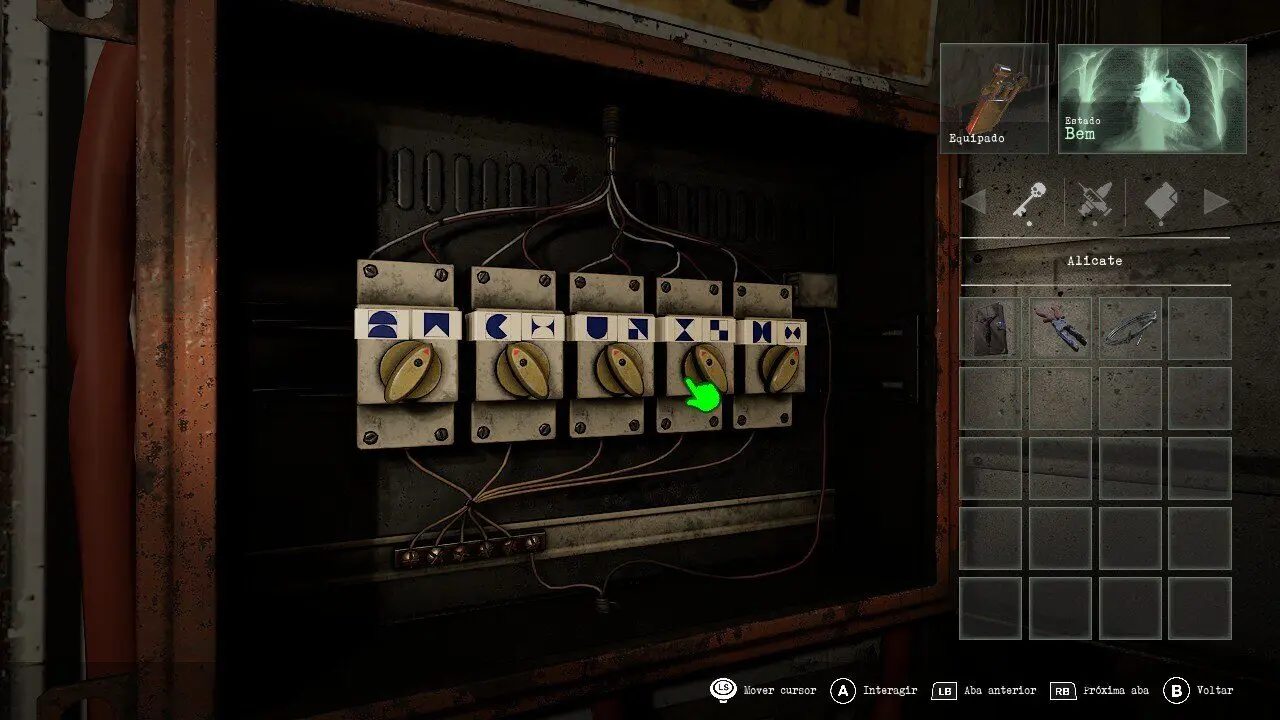 Logo que entrar, colete as Anotações da Irmã Angélica 2 (5/64) sobre a escada logo na entrada, abra o armário para conseguir a Fita de gravação, no banco ao lado existem Cartuchos de escopeta, quando terminar, saia e verifique o quadro de energia, use o alicate para cortar o arame que fecha a caixa para receber o Fio. Abra a caixa de energia, você terá de organizar os seletores na ordem correta. Partindo da esquerda para direita selecione: