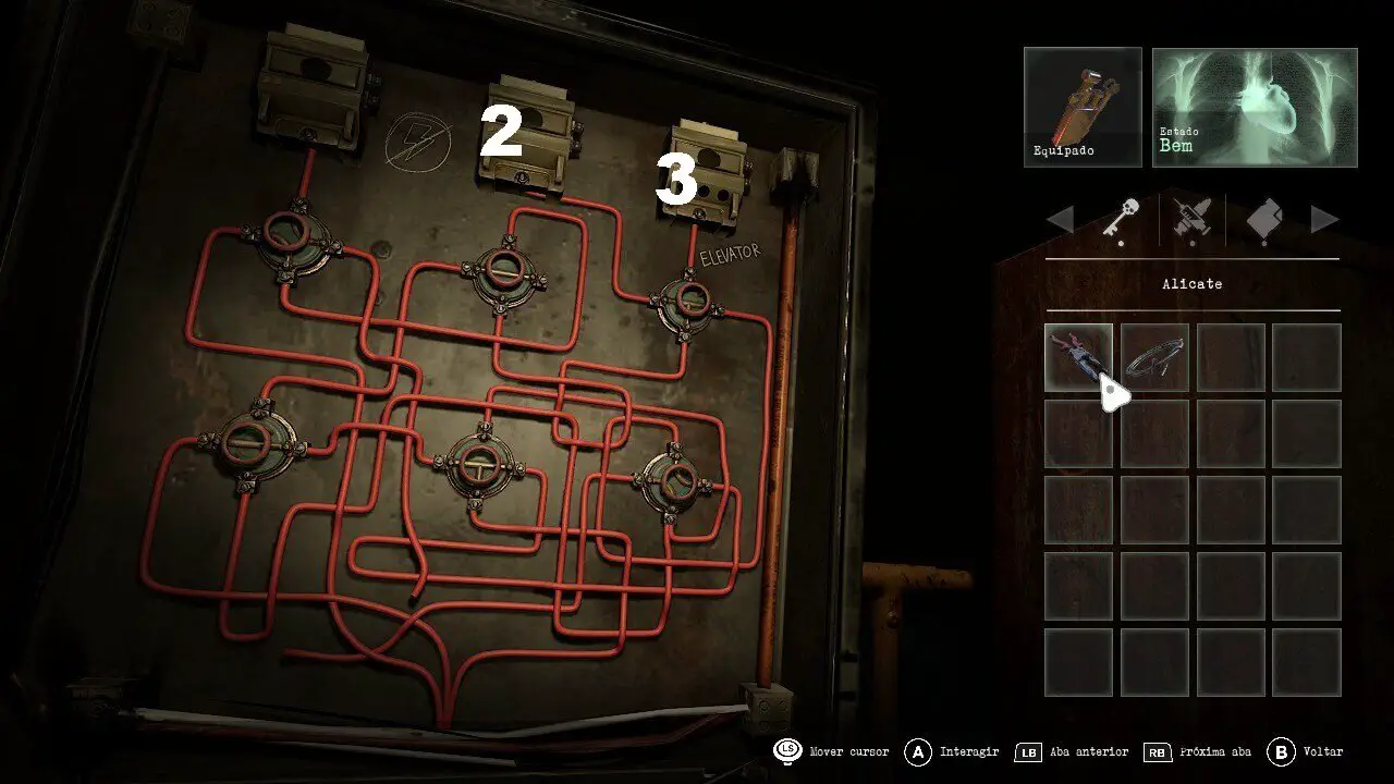 Atravesse o corredor tomando cuidado com os vapores e verifique o painel na extremidade. Esse é um quebra-cabeças que parece bem difícil, mas movimentando as peças corretamente, ele fica bem simples. Confira a solução abaixo: