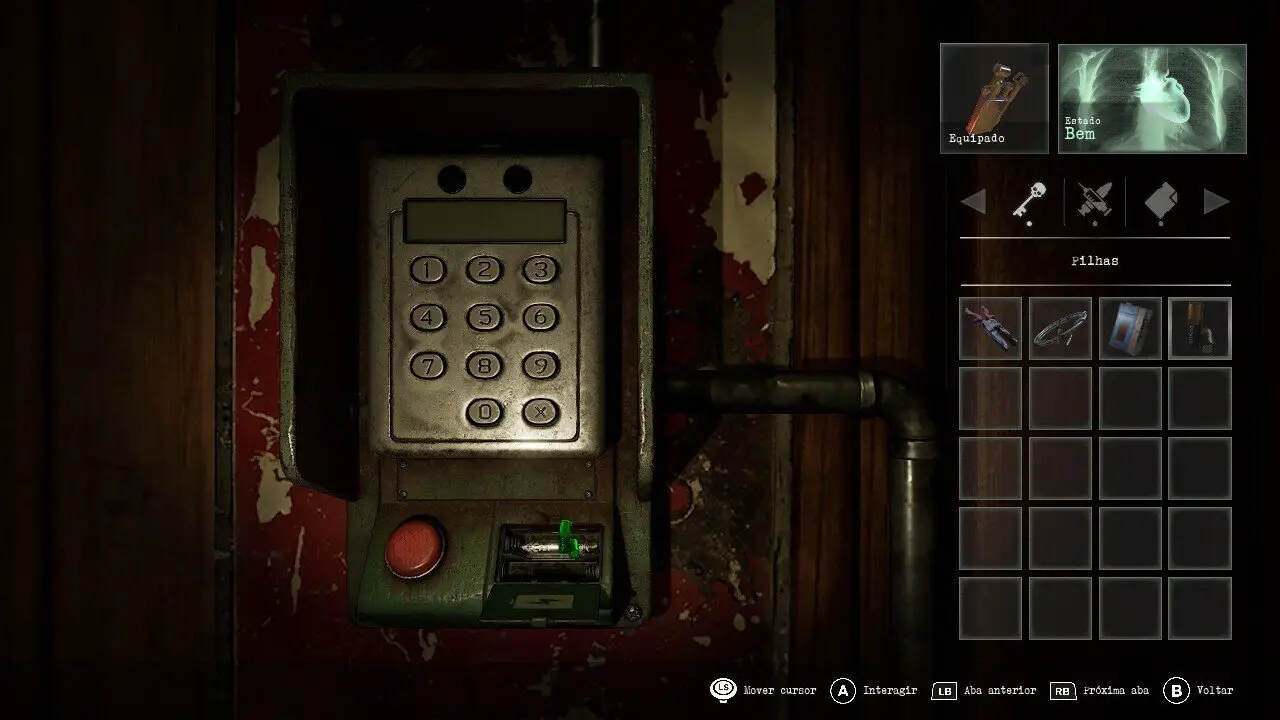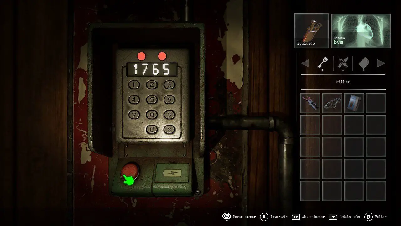 Siga pelo lado direito do elevador e use a porta simples à esquerda no final do corredor, suba a escada e cuidado com o inimigo no caminho, atrevesse o corredor e colete o Tubo de ensaio ácido no banco ao lado dos trajes de mergulho. Abra seu inventário e examine o lado de trás do toca-fitas, retire a tampa do compartimento de pilhas para conseguir as pilhas. Verifique a porta fechada aqui para ter acesso ao painel, verifique o compartimento de pilhas dele e coloque as pilhas que acabou de conseguir. Digite a senha 1765. Após abrir a porta, retire e leve as pilhas com você.