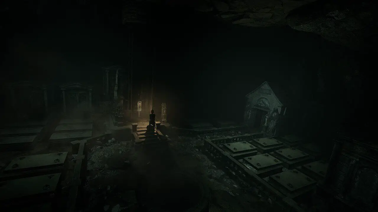 Na bifurcação, siga pelo lado direito e suba a longa escada, logo que a escada terminar, entre no mausoléu do lado esquerdo e colete os pregos em rolo e o Diário do coveiro Lázaro 2 (29/64). Saia e entre no mausoléu oposto, abra o caixão e colete o Mostrador de tartaruga, saia e desça a escada, entre no corredor direito e passe pelo portão no final.