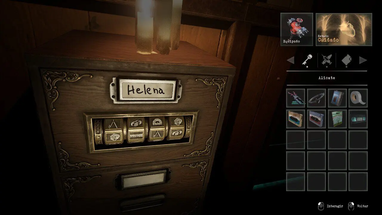 Cuidado com a armadilha no centro da sala, suba a pequena escada e colete a povidone no armário e o Bilhete de Helena na mesa, volte até o corredor.