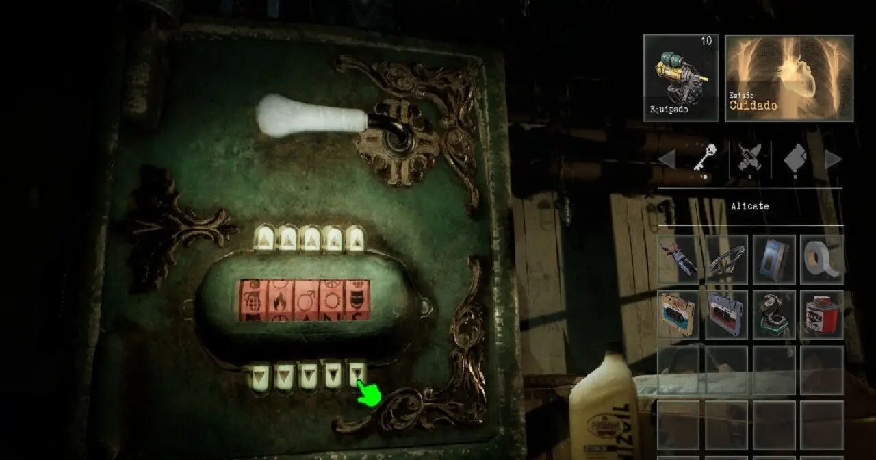 Elimine o manequim na sala e examine o cofre no centro da sala, teremos de resolver um enigma. Você terá de inserir os símbolos na ordem correta, confira abaixo: