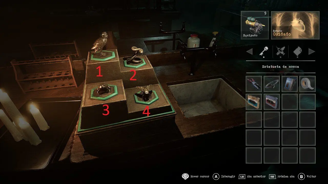 Elimine os dois manequins na sala e verifique o objeto sobre a bancada central, usaremos as estátuetas que coletamos anteriormente aqui, precisando coloca-las de maneira correta. Da esquerda para direita, na ordem superior, inferior, superior, inferior, coloque as seguintes peças: