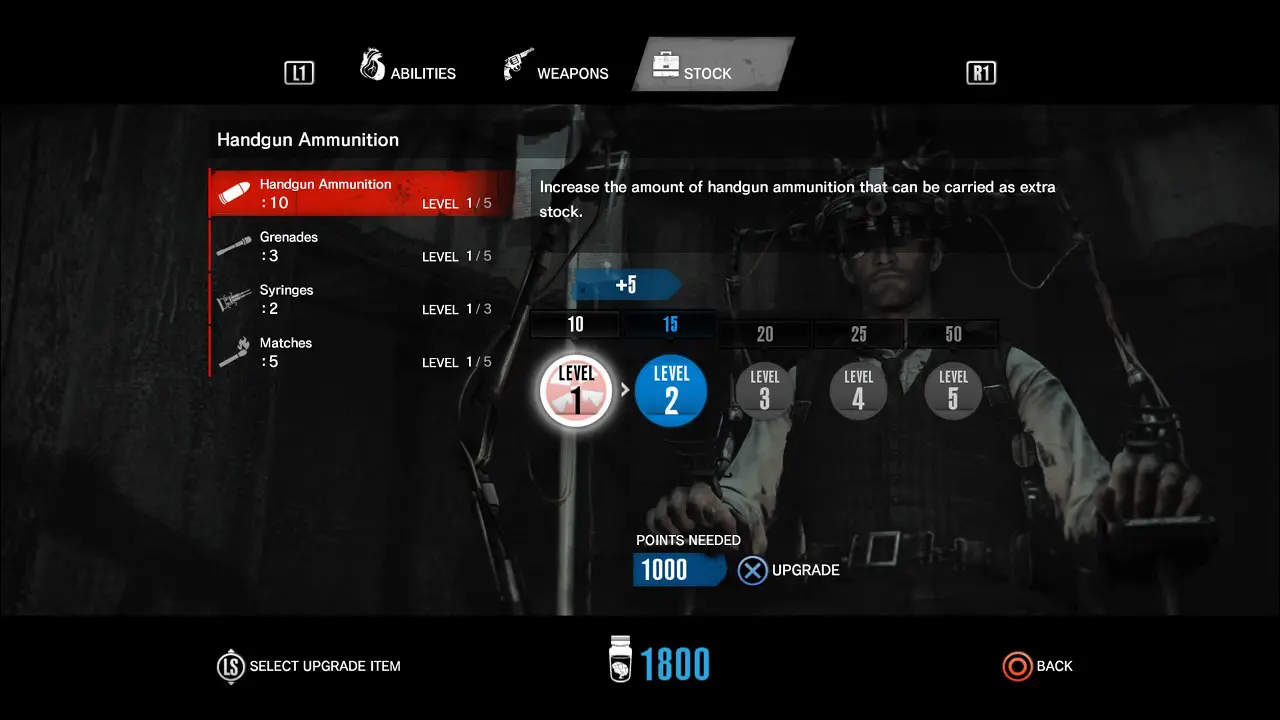 Salve seu progresso e siga para a sala com a cadeira, repare que Sebastian está muito mais propenso a utilizar o rústico mecanismo de upgrade. Aqui poderemos melhorar três atributos, sendo eles Abilities (habilidades, Weapons (Armas) e Stcok (Armazenamento). Teremos mais opções conforme avançamos no jogo.