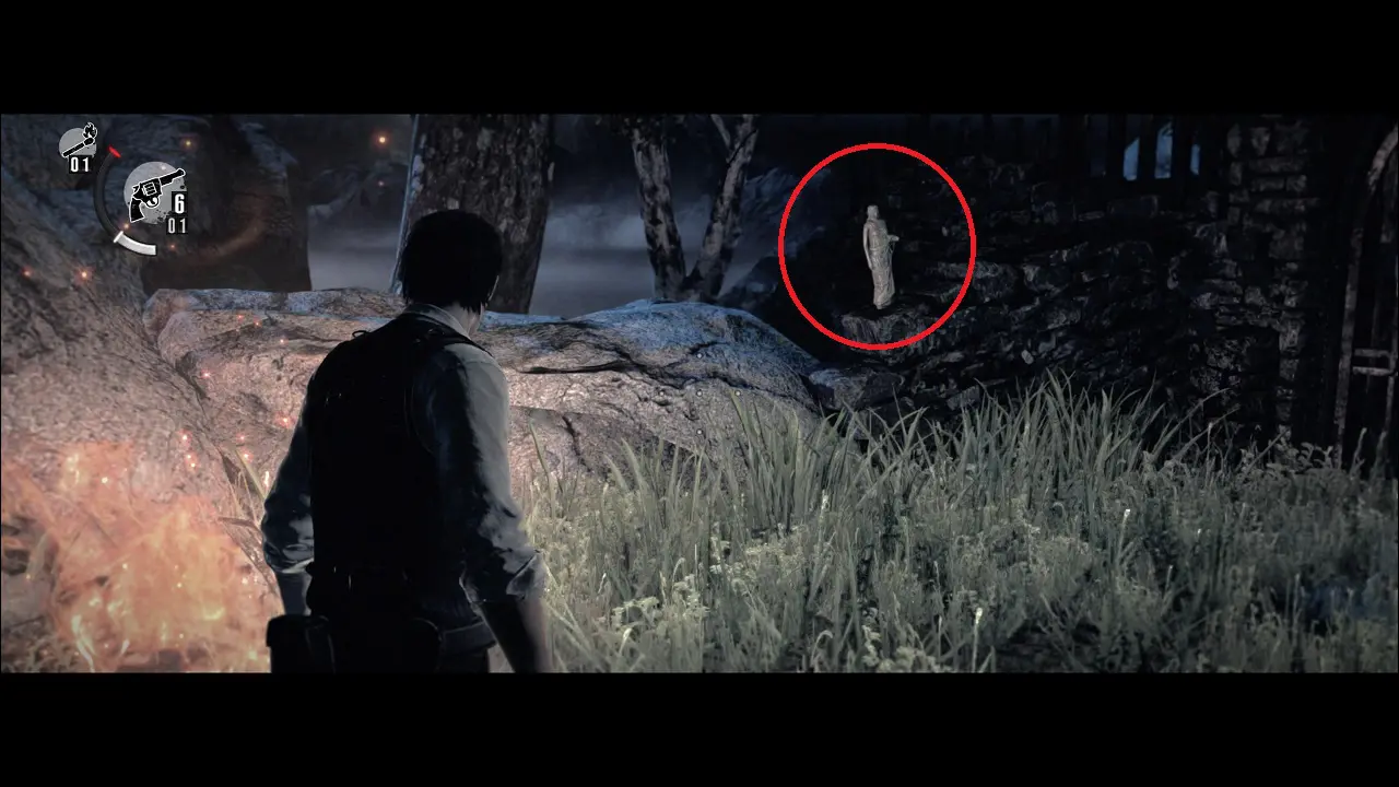 Caso ele deixe cair uma Syringe, considere usar ela imediatamente, afinal estamos com pouco HP. Entre na cabana e continue seguindo Leslie, chegaremos em uma fogueira, repare na estátua do lado esquerdo do portão, quebre ela para conseguir uma Ordinary Key (1/46), falaremos sobre ela no próximo capítulo.